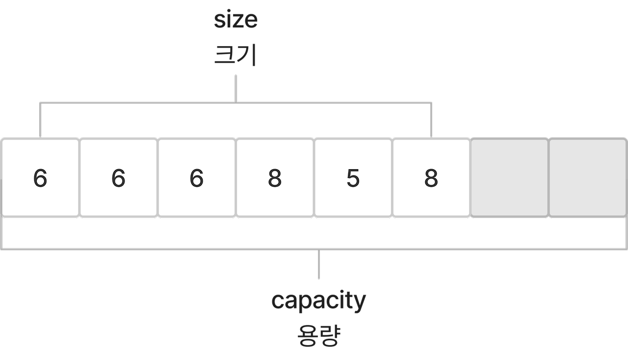 - 동적 배열의 내부에서는 배열의 크기가 커지는 것에 대한 여유분의 메모리를 확보하고 있고, 실제로 동적 배열을 사용하는 프로그램에서는 실제 사용 중인 배열의 크기만 인식한다.
