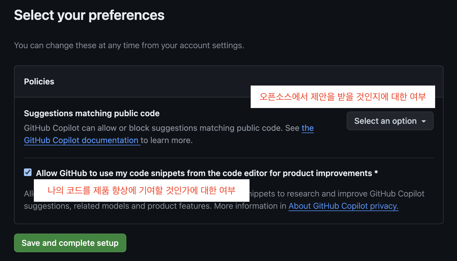 설정은 Settings > Copilot 에서 언제든지 변경 가능하기 때문에 잘못 설정했다 하더라도 github 설정 창에서 변경하면 되니 안심하세용!